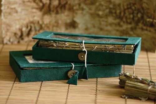 Verpackt in dunkelgüner Schmuckbox mit Beschreibung.