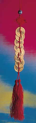 Die Münze ist von altersher in China das klassische Symbol für Glücks- und Wohlstandsmehrung. Eine einzelne Münze steht für diesen Aspekt im Ganzen. Ein gar geflochtenes Münzband gibt uns ein sehr schönes Beispiel, wie verstrickt und verflochten wir mit dem Schicksal und den Gegenständen in dieser Welt sind. Eine Wechselwirkung, die uns zum Nachdenken auch über unser seelisches Wohl einlädt. Das geflochtene Band der Münzen soll darüber hinaus sinnbildlich den Reichtum an unser Schicksal knüpfen. Ein mächtiges Glückssymbol in unserer sich stetig wandelnden Welt.