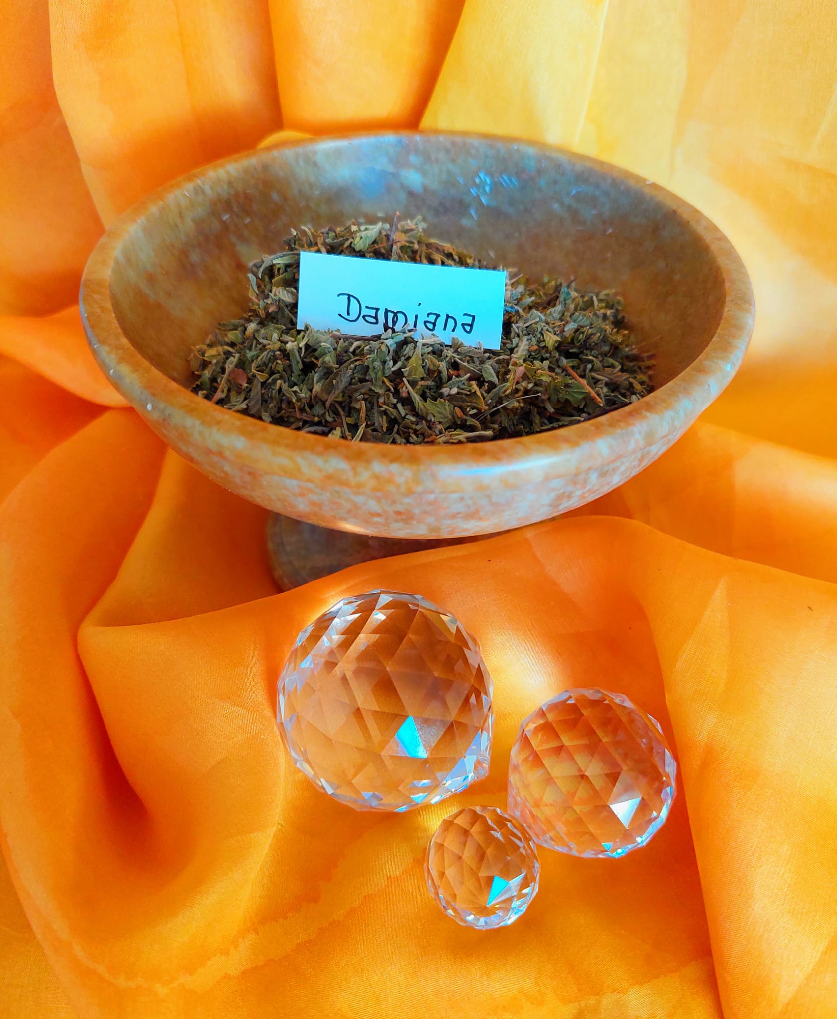 Damiana wird in Südamerika in Liebestränken verwendet, da es unsere Herzen öffnet. Beim Räuchern verströmt es einen süßlichen, leichten und weichen Duft. Es wirkt anregend, stimmungsaufhellend und sanft euphorisierend. Es bringt unsere Energien wieder zum Fließen und stärkt unsere Intuition, Erkenntniskraft und Visionsfähigkeit.