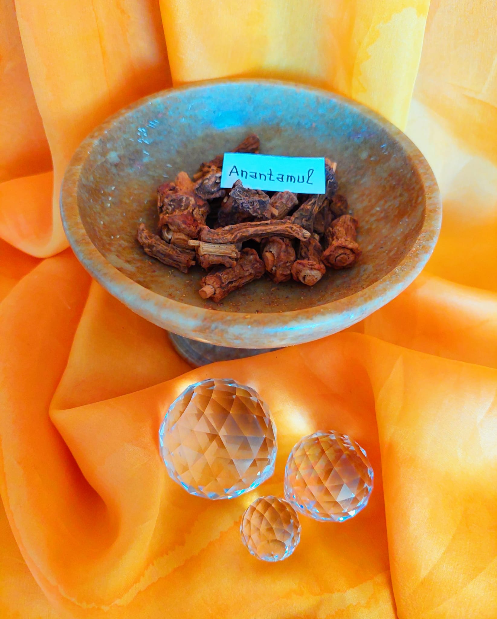 Das Sanskrit-Wort für Anantamul ist Sugandhi, was soviel bedeutet wie (süßer) Wohlgeruch. Im Ayurveda wird neben dem besonderen, süß-balsamischen, karamelligen Duft auch eine allgemein stärkende Wirkung beschrieben.