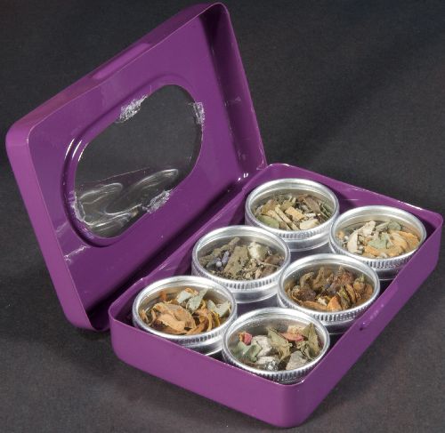 Um möglichst viele unserer Harze und Räuchermischungen kennenzulernen, haben wir diese Räuchersortimente in Döschen entwickelt. In süssen, kleinen Metalldöschen mit durchsichtigem Deckelchen in hübscher lila Metallbox ist diese Räuchermischung zum Ausprobieren.