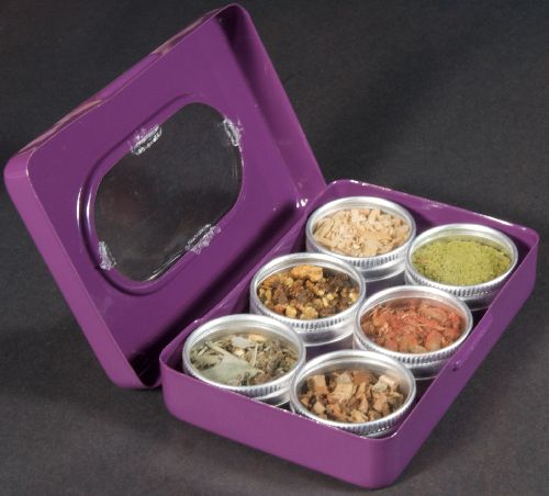 Um möglichst viele unserer Harze und Räuchermischungen kennenzulernen, haben wir diese Räuchersortimente in Döschen entwickelt. In süssen, kleinen Metalldöschen mit durchsichtigem Deckelchen in hübscher lila Metallbox ist diese Räuchermischung zum Ausprobieren.