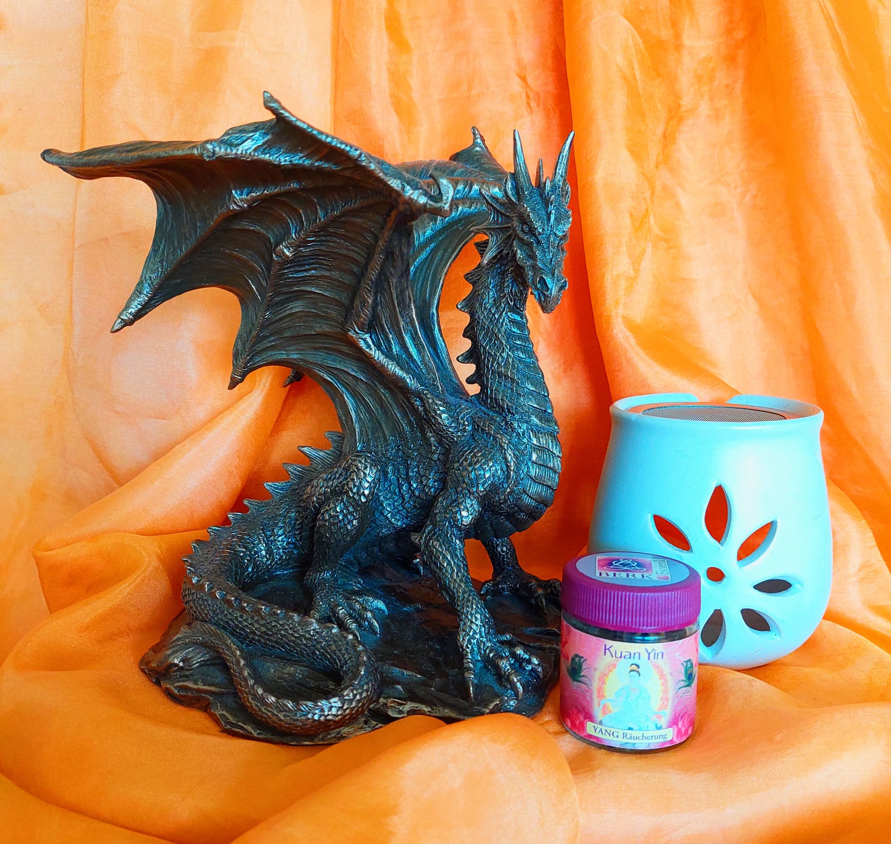 Die Yang Räucherung mit der Feuerkranz-Kuan-Yin wirkt stark klärend und schafft Licht und Raum. Leuchtend rotes Drachenblut und strahlendes Gold helfen uns, Hindernisse zu bereinigen und Orte von stagnierenden Energien zu befreien.
