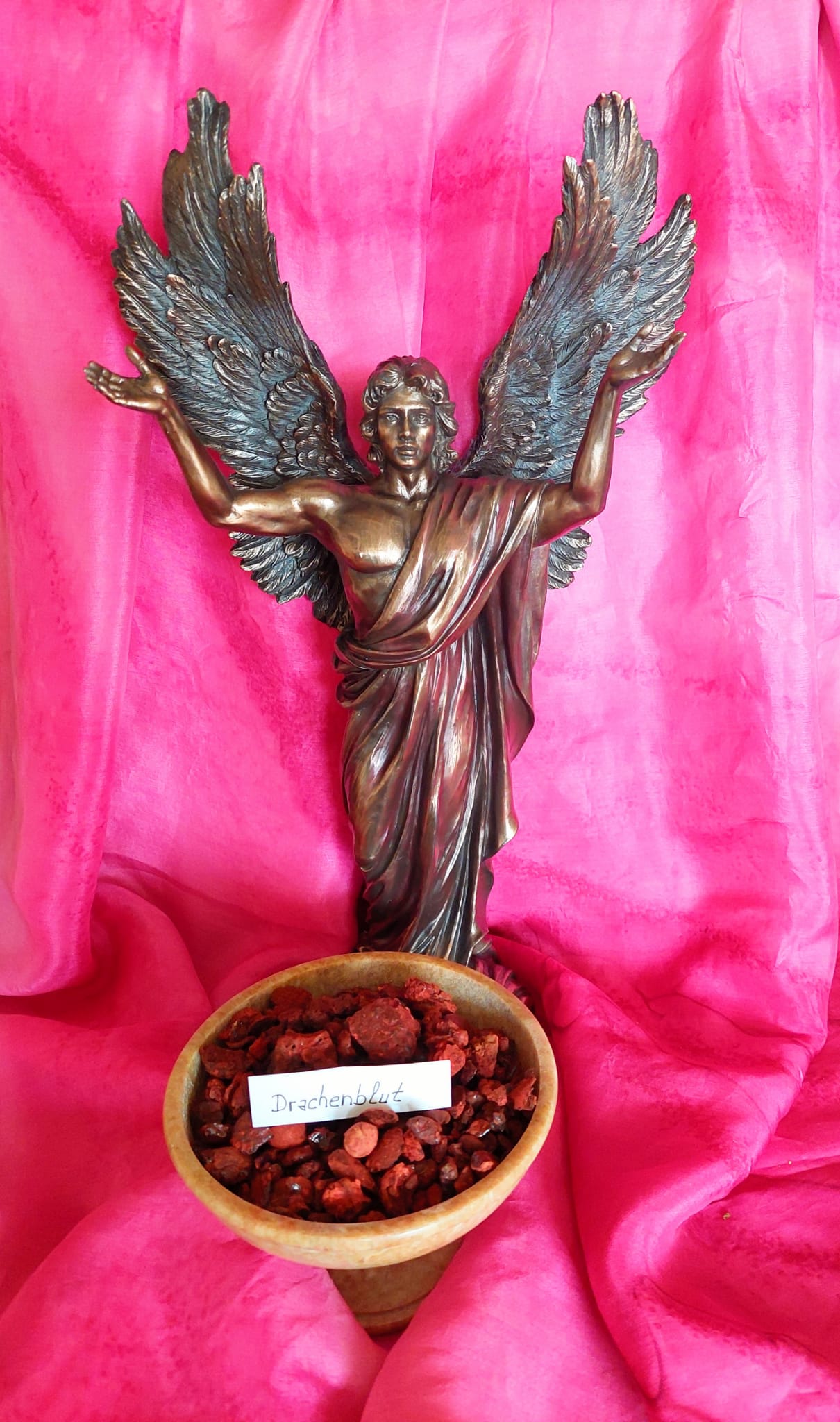 Das tiefrote Harz aus Drachenblutgewächsen wirkt erdend, stabilisiert das Wurzel- Chakra und umgibt uns mit einem Schutzschild gegen negative Energien. Es verleiht uns Drachenkraft, fördert klare Entscheidungen und hiflt uns im Hier und Jetzt anzukommen. Der Duft des Drachenblutes ist würzig und etwas streng.
