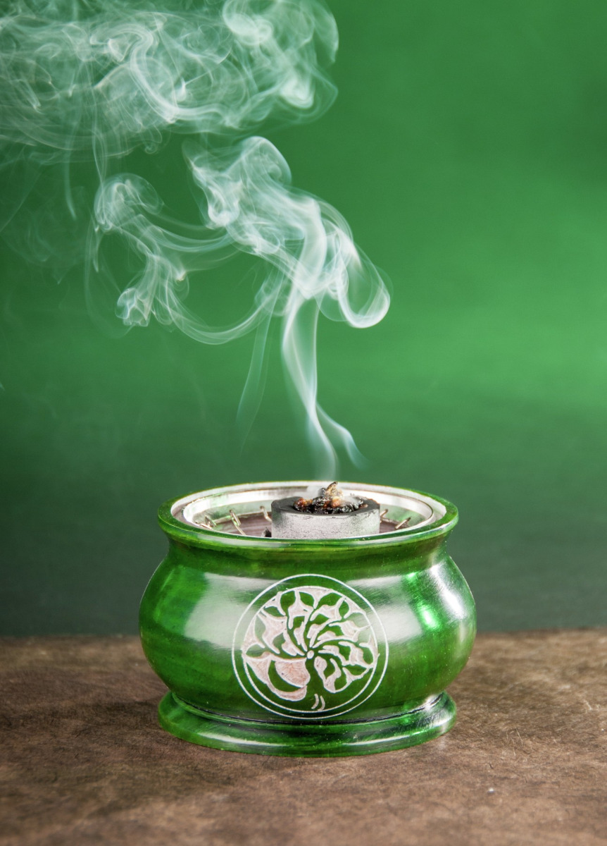Edles, schweres Netzgefäß aus Speckstein. Dieses Gefäß wird auch mit glühender Kohle nicht heiß. Man kann es ohne Unterlage auf jeden Tisch stellen und gefahrlos räuchern. Die Kohle wird einfach auf das großmaschige Netz gelegt und angezündet.
